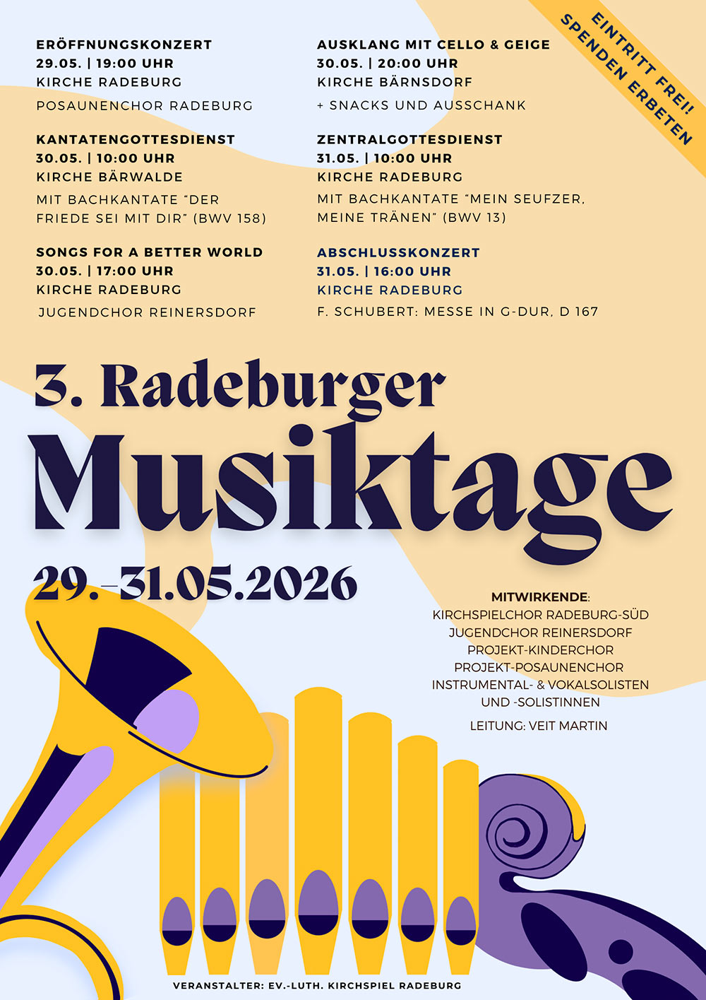 Vielfältige Musikgruppen, Kreise und Interessen finden in der Kirchgemeinde Radeburg ihr geistiges Zuhause. Durch ihre Gestaltung werden viele Gottesdienste und das Leben im Haus Gottes persönlich und lebendig.